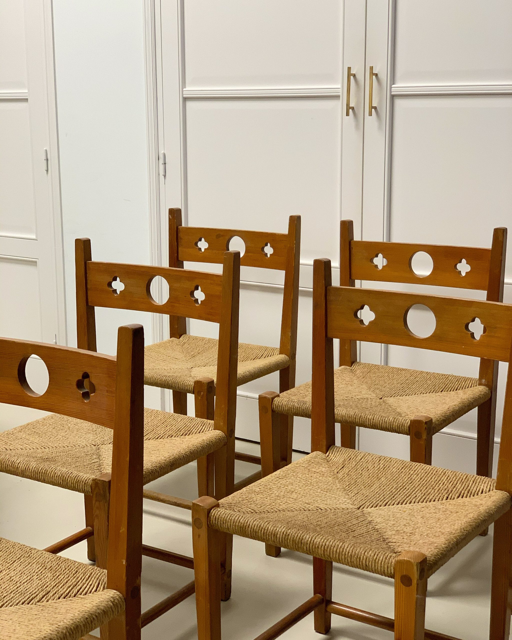 6 sillas de madera y enea francesas, años 60.
