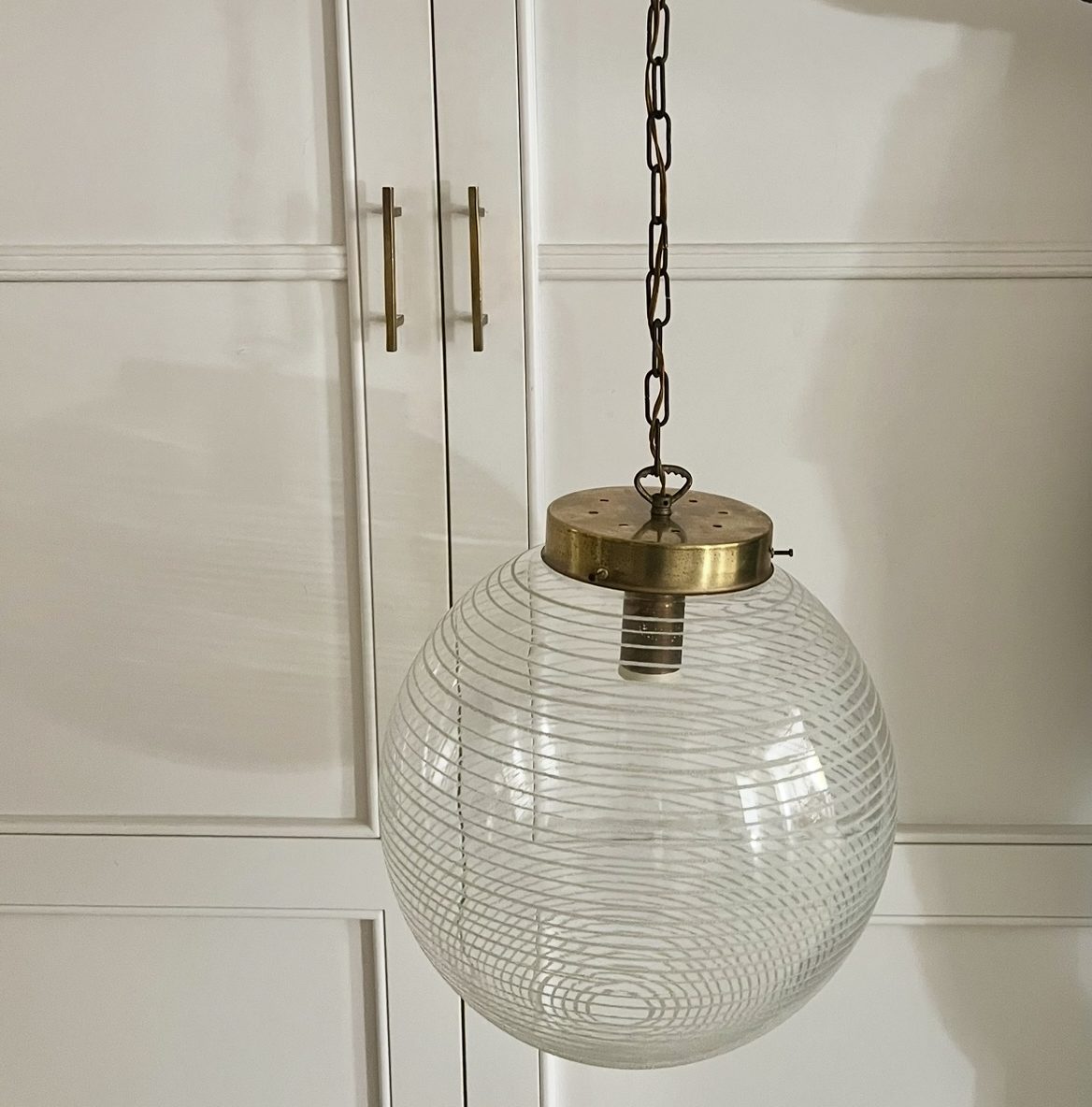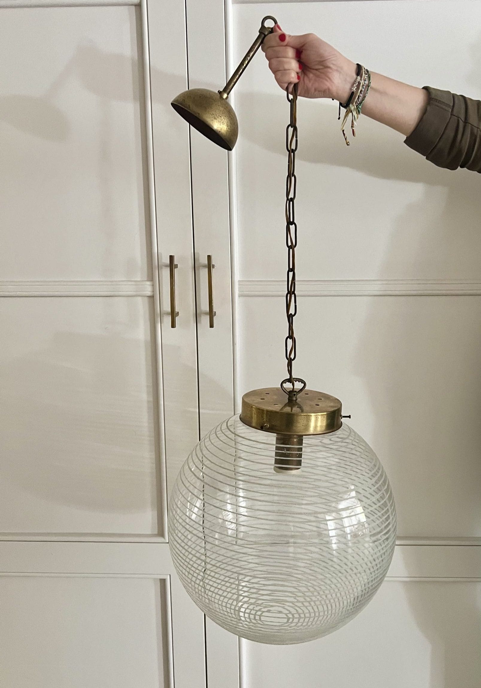 Lámpara suspendida de cristal de murano con rayas. Cadena y anclaje en latón.