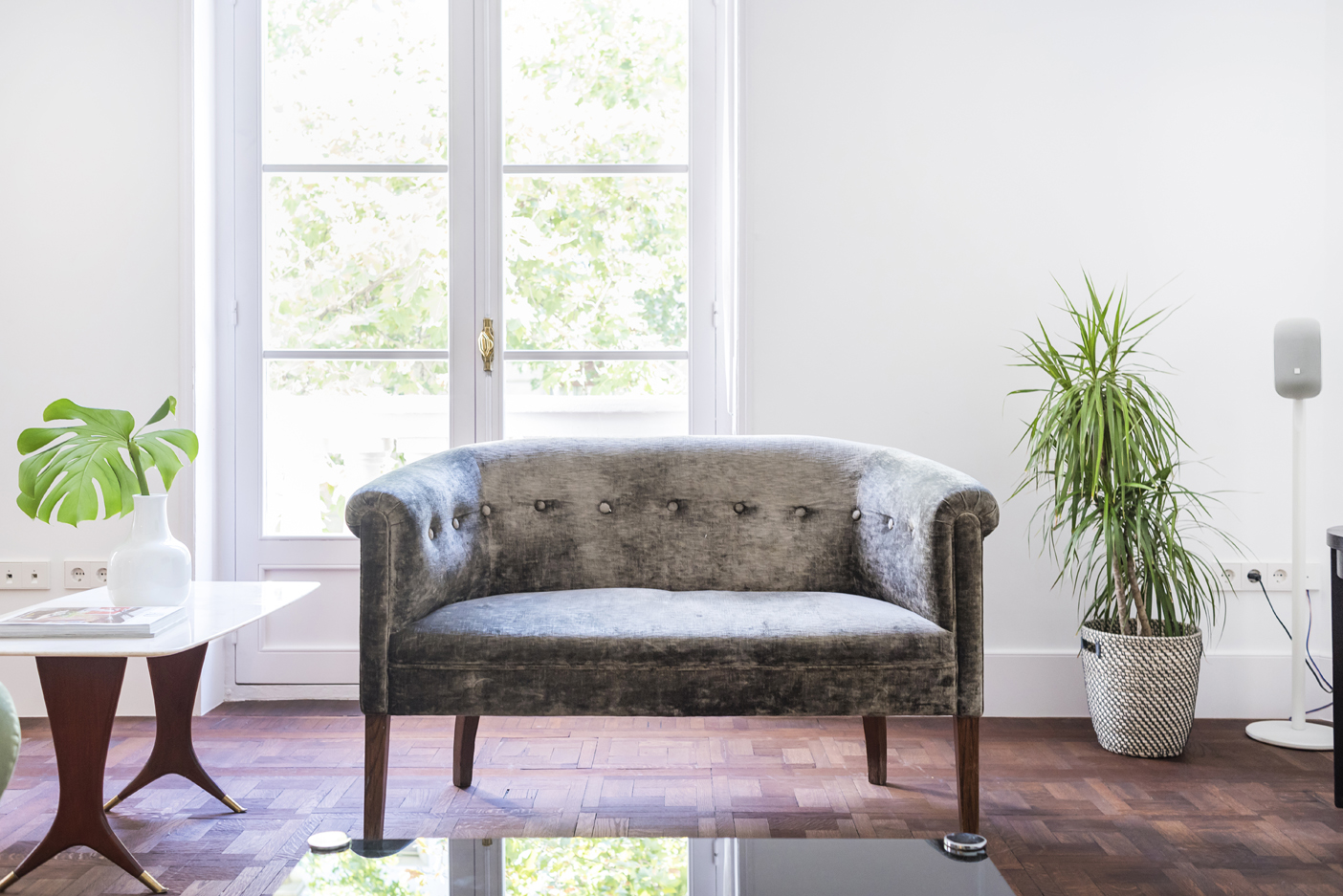 Sofá de dos plazas con estructura y patas de madera.