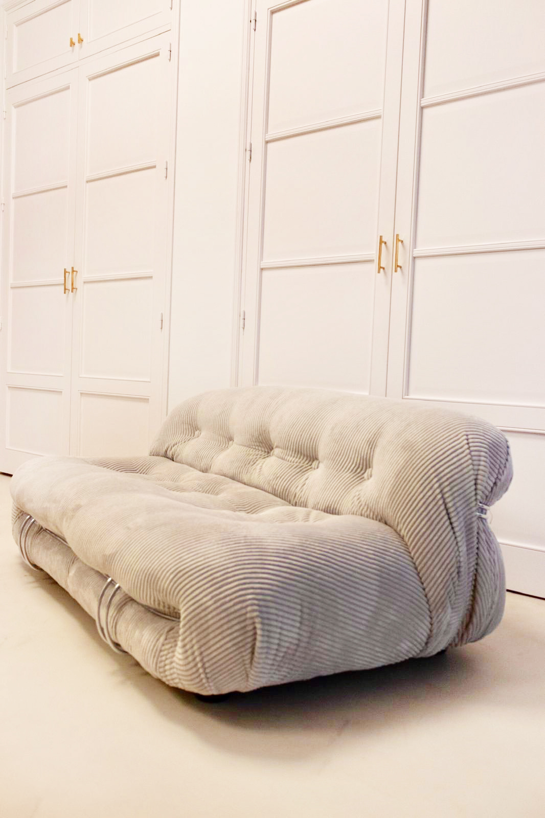 Sofá ¨Soriana¨ diseñado por Tobia Scarpa y editado por Cassina en los años 70. Tapizado en pana gruesa gris clara.